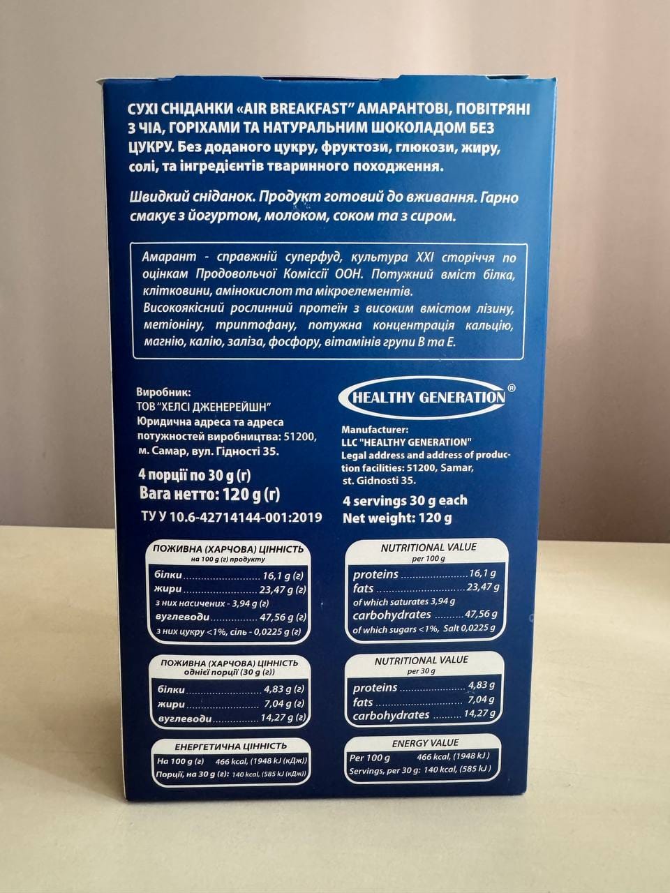 Сухий сніданок амарант шоколад арахіс AIR Breakfast 120 г | Healthy Generation