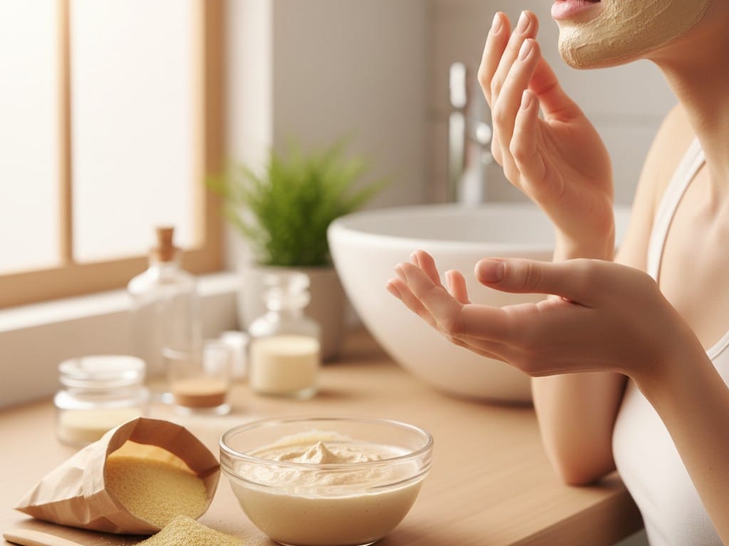 • Скраб для тіла: Дрібні частинки борошна делікатно очищують пори, не травмуючи епідерміс, що робить його чудовою основою для домашнього пілінгу.