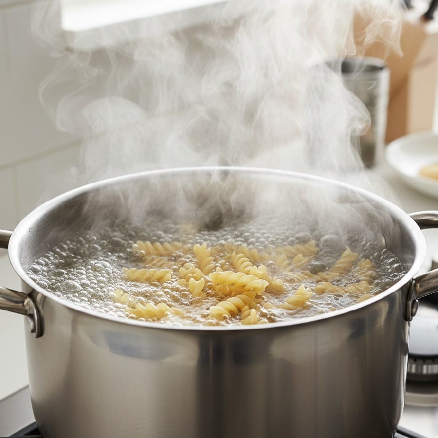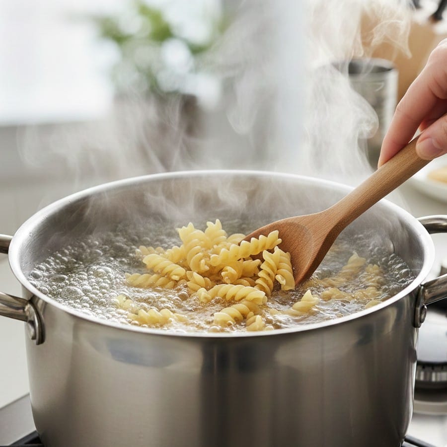 На початку варіння пасту варто акуратно перемішати, щоб вона не злиплась. Далі — залишити її варитися без активного втручання.
