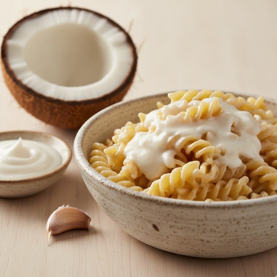 На сковороді злегка прогрійте оливкову олію, додайте подрібнений часник. Влийте кокосове молоко та тушкуйте 3–5 хвилин до легкої густоти. Додайте спеції за смаком і з’єднайте з готовою рисовою пастою.